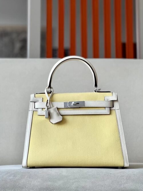 Hermes Kelly Swift & Canvas 1Z Light Yellow & Creamy White Silver Hardware 28cm Full Handmade